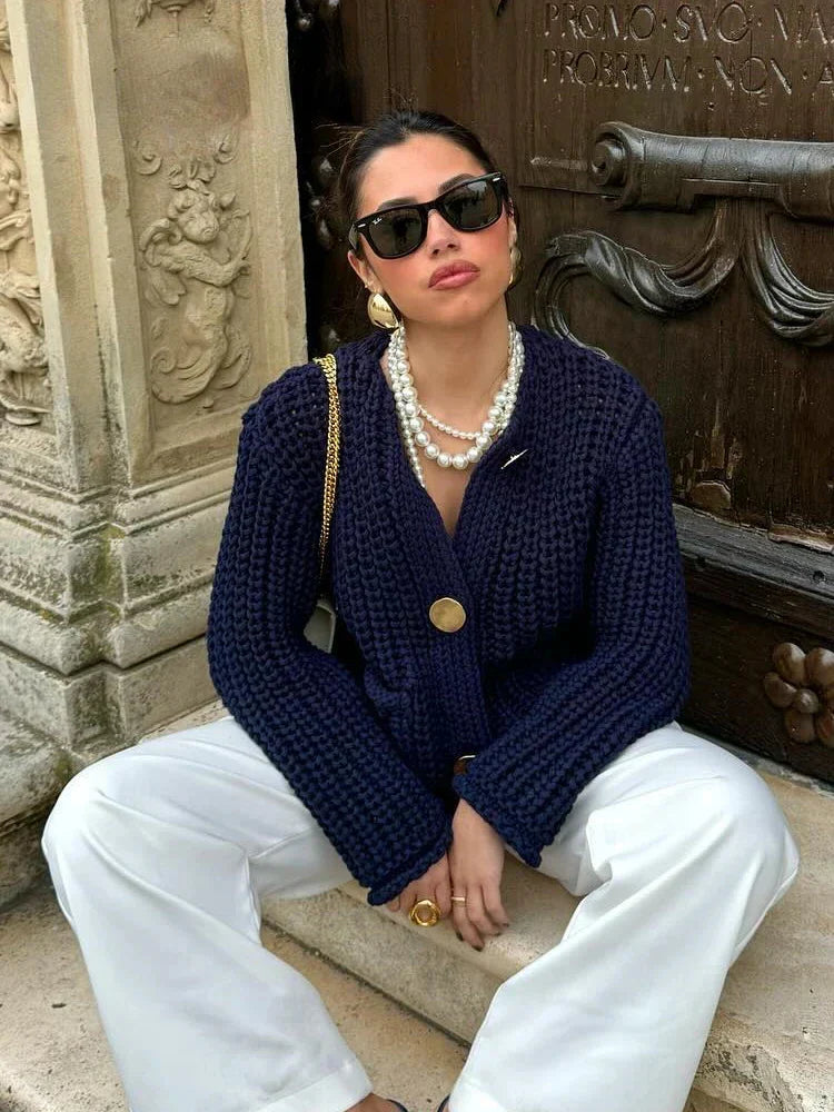 The Solace Cardigan in navy combines comfort and style in a thick, warm cardigan with large buttons and practical pockets .