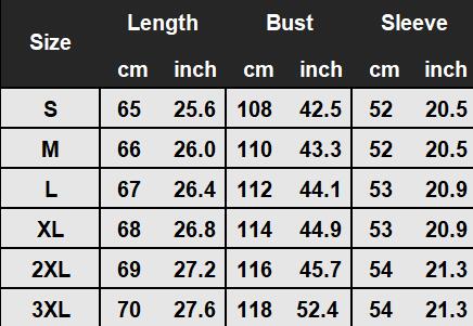 Size | Length (cm/inch) | Bust (cm/inch) | Sleeve (cm/inch) | US Size | EU Size |