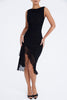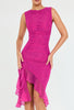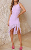 This trendy sheath dress with a round neckline is a stunning fashion statement. The short skirt is a sexy design element with a gathered bow detail that creates a charming look.