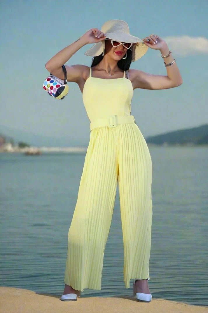 Discover effortless elegance with our sleeveless jumpsuit with wide-legged trousers and belt. This fashionable piece combines a sleek sleeveless design with flowing, wide-legged trousers for a flattering , modern silhouette.