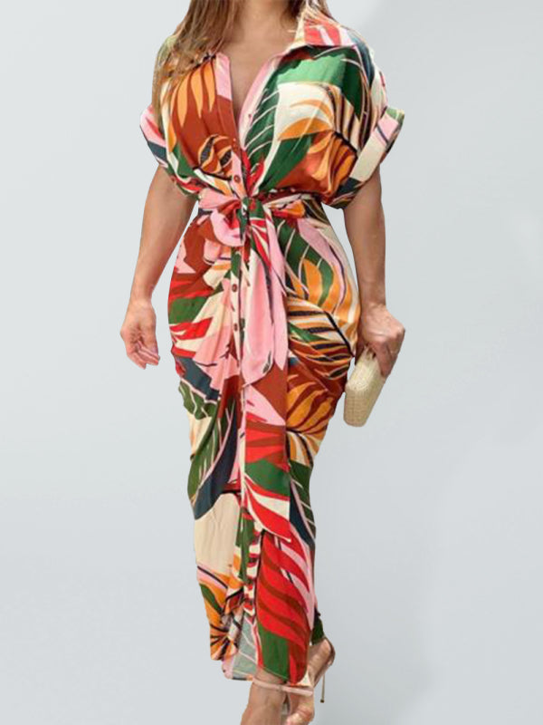 Women's printed lapel short sleeve high waist single breasted midi cardigan dress!