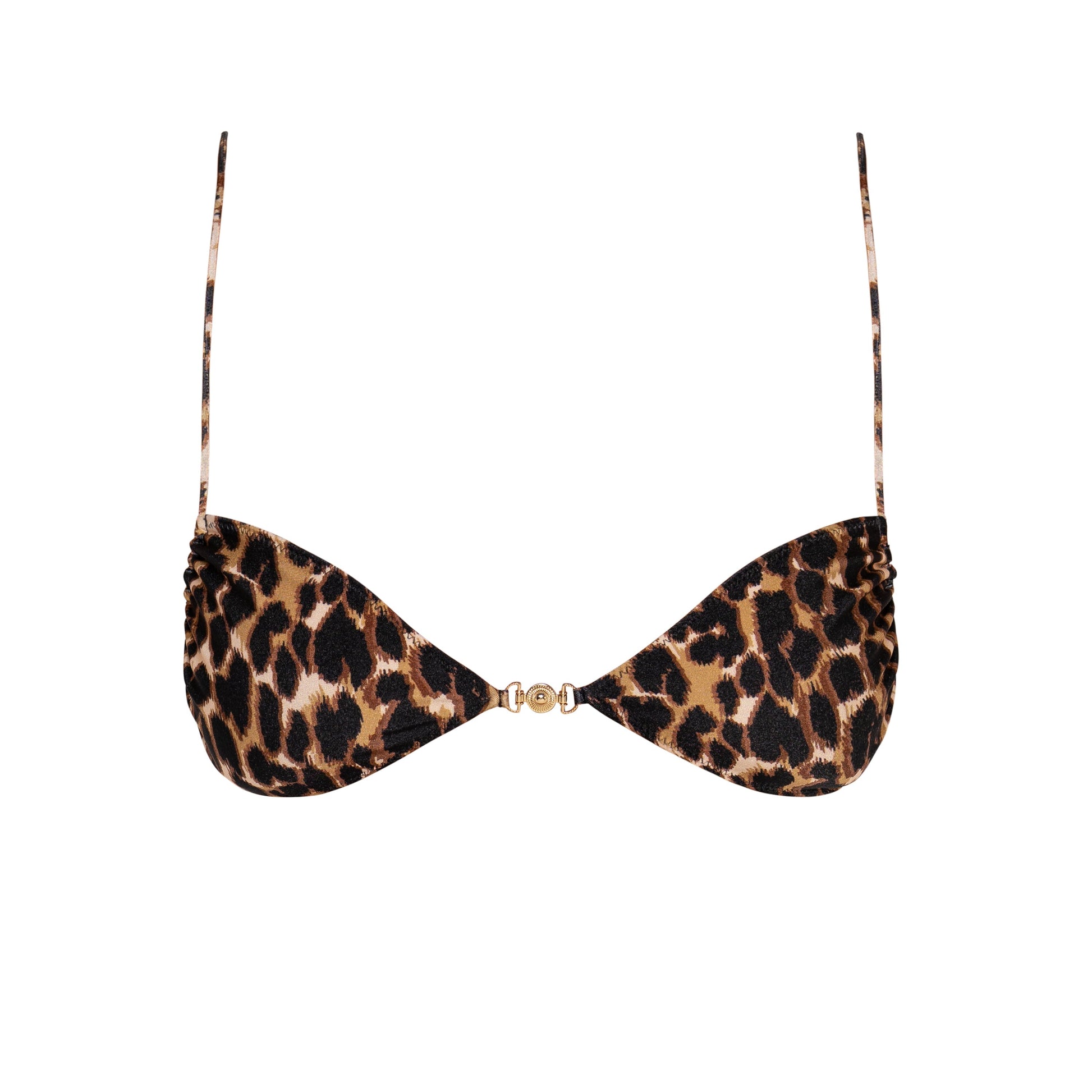 The Ella in Leopard Luxe by Sommer Swim is a bralette bikini top with visible tie details, delicate gold hardware, adjustable coverage, and an embossed gold clip closure.