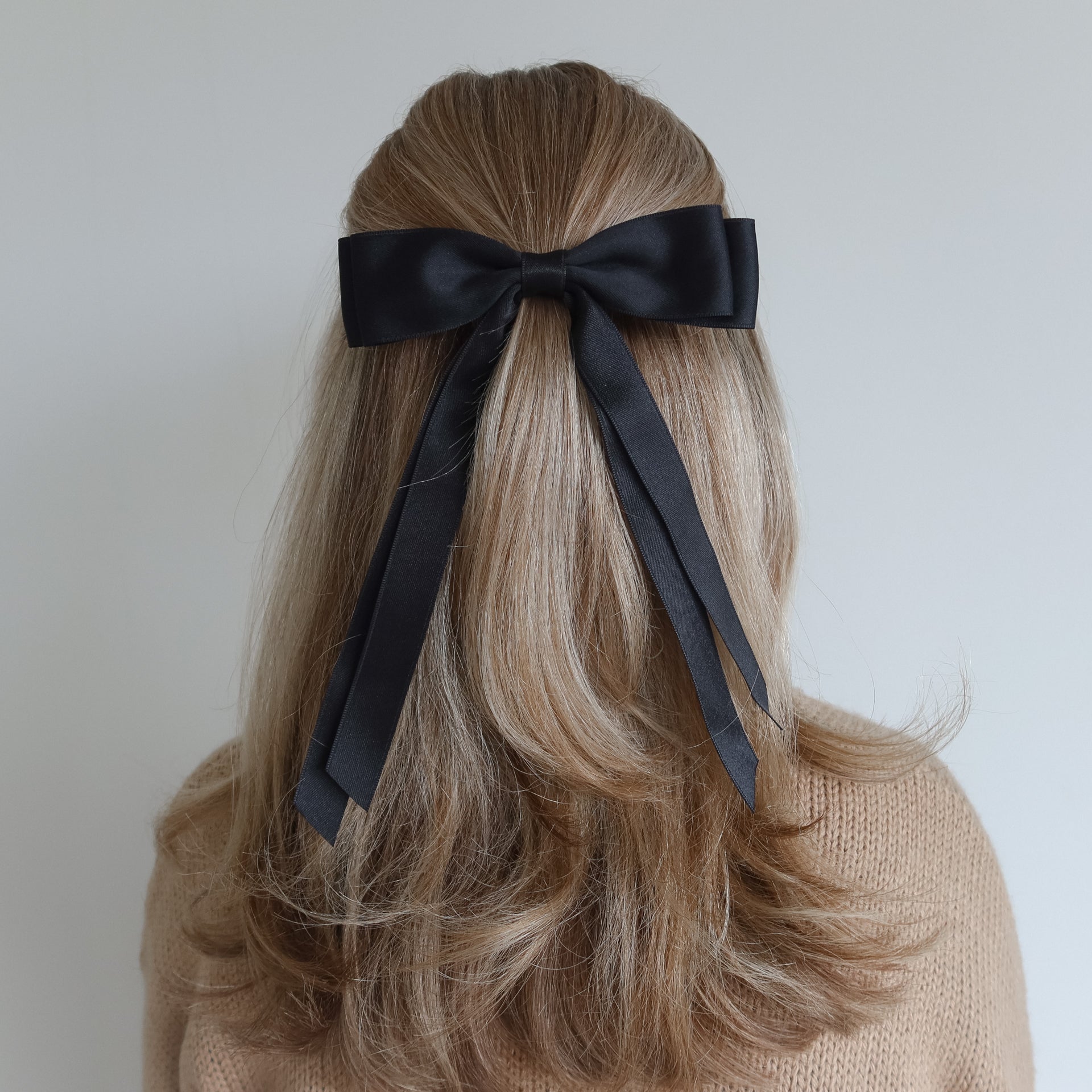 A sleek black hair bow made from fluff adds a touch of understated elegance to any ensemble. Its soft texture and deep hue exude sophistication, effortlessly elevating even the simplest outfits. Whether worn in a ponytail, bun, or braid, this versatile accessory adds sophisticated charm to your look. The rich black color complements a variety of styles and occasions , from casual outings to formal occasions, making it a wardrobe essential.