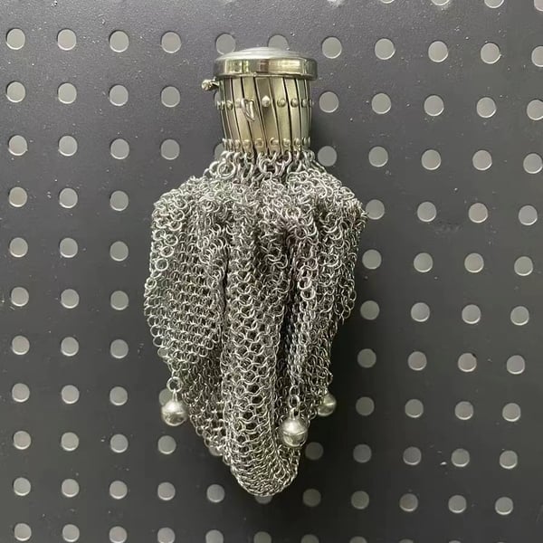Fügen Sie Ihren täglichen Essentials einen Hauch von Vintage-Eleganz hinzu. Hergestellt aus ineinandergreifenden Metallringen, bietet dieser einzigartige Münzbeutel sowohl Flexibilität als auch Stil. Perfekt zum Tragen von Münzen oder kleinen Kosmetika, verbindet er historischen Charme mit praktischer Nutzung. Jedes Stück ist handgewebt, um distinctive Handwerkskunst und dauerhafte Qualität zu zeigen.